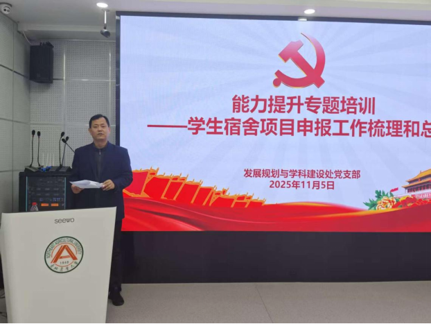 随后,会议聚焦能力作风建设进行专题培训。朱志猛以学校学生宿舍重点项目申报工作为具体案例,作了题为《学生宿舍项目申报工作梳理和总结》的专题报告。他系统梳理了该项目从需求论证、数据测算、方案优选、项目申报的全过程,旨在通过实例剖析、“解剖麻雀”,提升全体党员运用系统理论解决实际复杂问题的能力;推动党支部“一融双高”建设,发挥党员先锋模范和党支部战斗堡垒作用,为学校事业发展贡献力量。